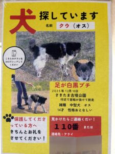 名前:クゥちゃん 特徴:足が白黒ブチの中型犬 見かけたら、110番で警察に保護依頼をお願いします。 アライさんの連絡先はこちらからお伝えしますので、一度病院へご連絡お願いします。